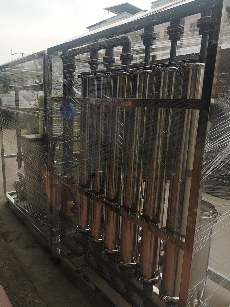 反滲透設施生產純水的關鍵有兩個,一是一個有選擇性的膜,我們稱之為半透膜,二是一定的壓力。簡單地說,反滲透半透膜上有眾多的孔,這些孔的大小與水分子的大小相當,由于細菌、病毒、大部分有機污染物和水合離子均比水分子大得多,因此不能透過反滲透半透膜而與透過反滲透膜的水相分離。 在水中眾多種雜質中,溶解性鹽類是最難清除的.因此,經常根據除鹽率的高低來確定反滲透的凈水效果.反滲透除鹽率的高低主要決定于反滲透半透膜的選擇性。目前,較高選擇性的反滲透膜元件除鹽率可以高達99.7%。
